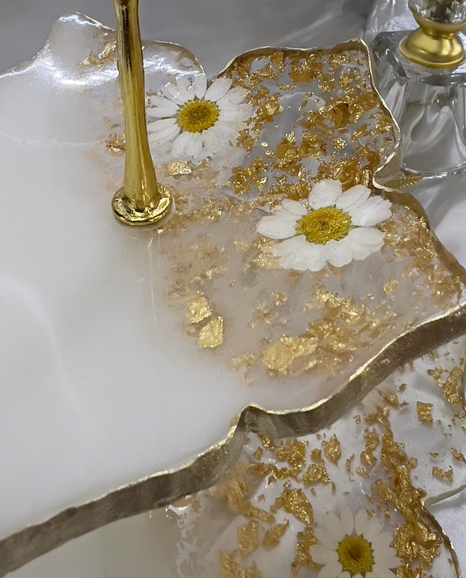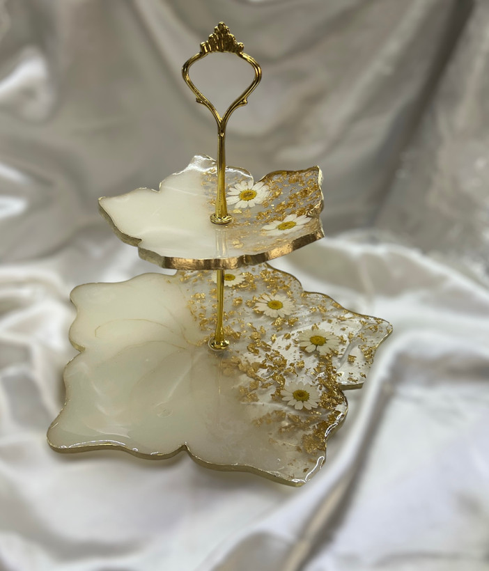 شیرینی خوری دو طبقه از جنس رزین کار شده با گلهای طبیعی بابونه