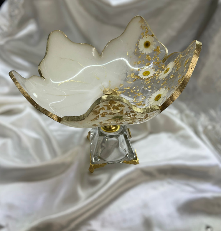 میوه خوری رزینی با پایه ی کریستال کار شده با گلهای بابونه طبیعی و ورق طلا