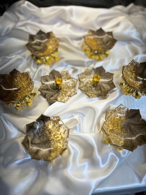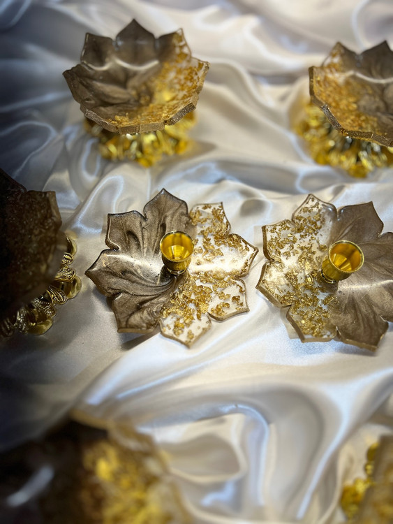 هفت سین رزینی طرح گل شامل یک جفت جاشمعی ۶ عدد پیاله و یک آینه و پایه