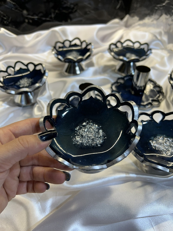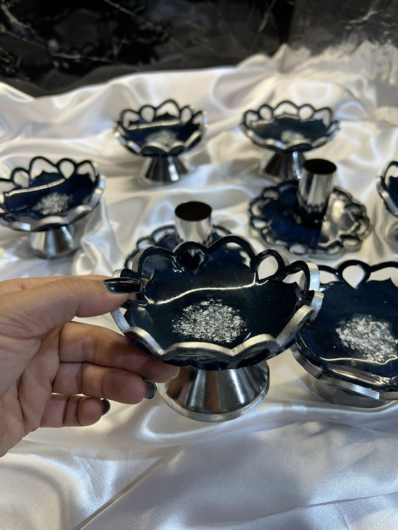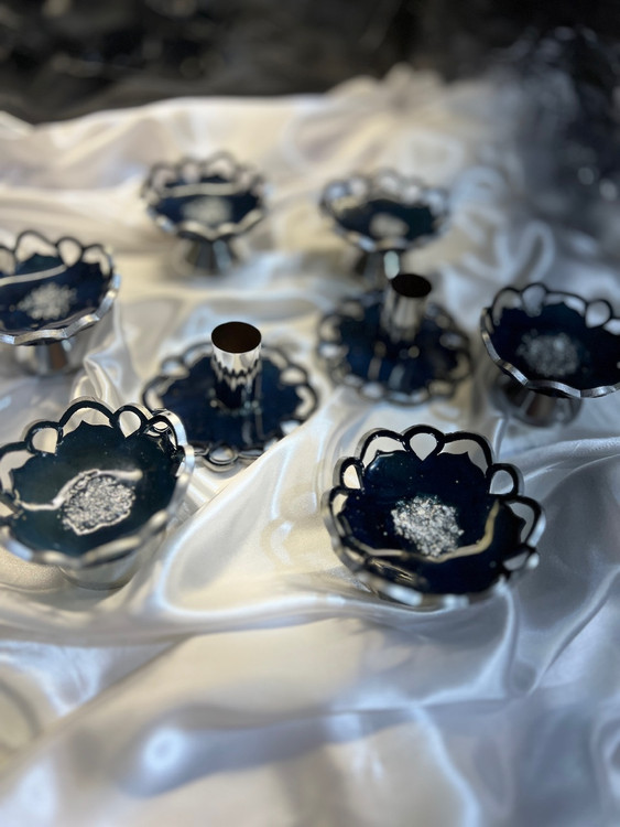 هفت سین رزینی طرح گل رنگ سورمه ای شاین دار کار شده با ورق نقره