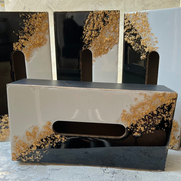جعبه دستمال کاغذی چوبی کارشده با رزین قابل سفارش در رنگ دلخواه جنس چوب ام دی اف درجه یک