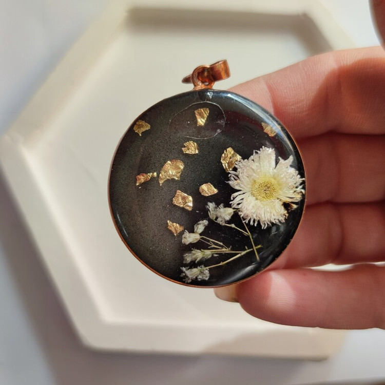 گردنبند دو طرفه یک طرف کارشده با گل طبیعی و طرف دیگر نوشته ، جنس مس، سایز۴سانت